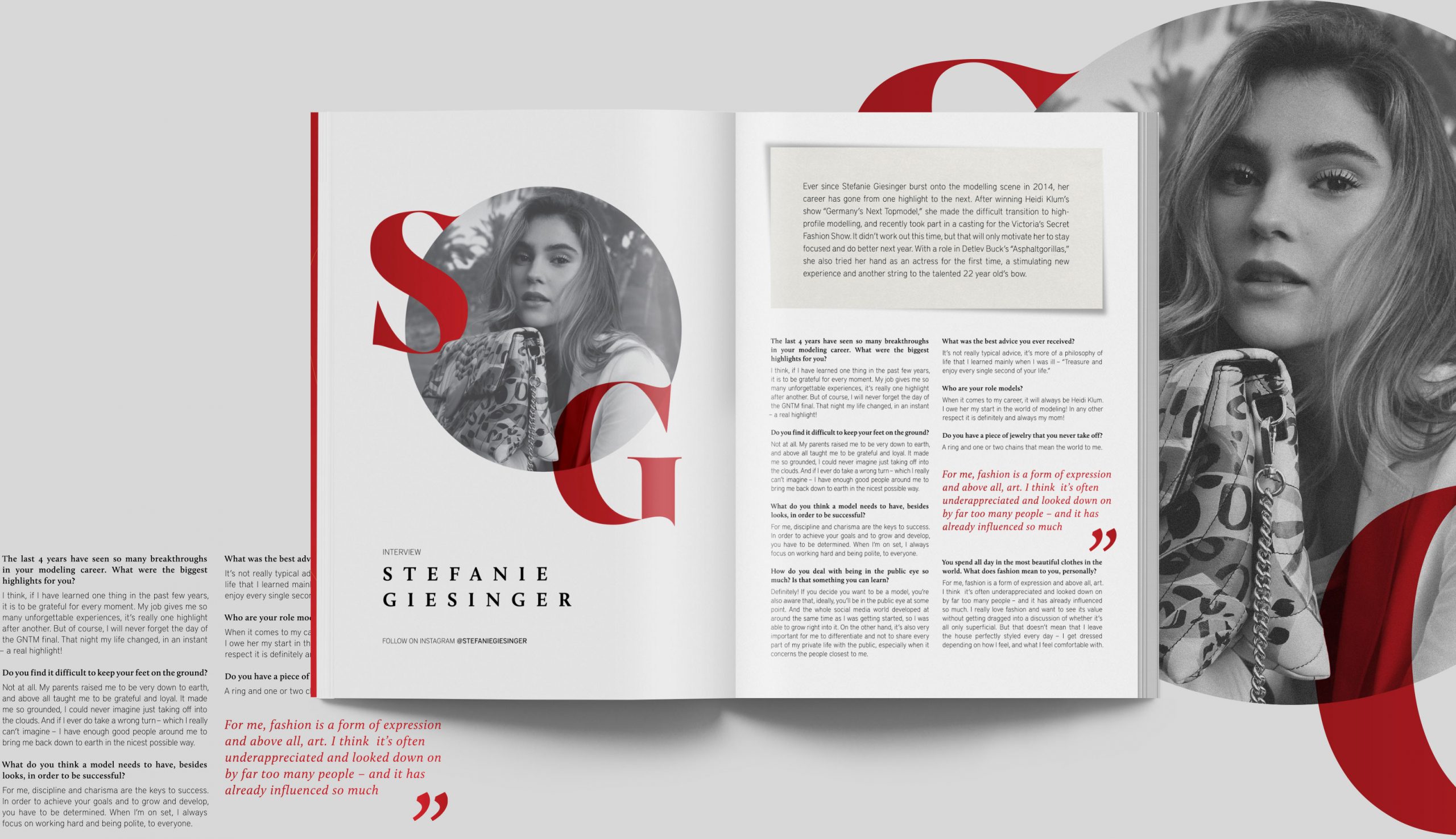 Editorial Design: Creating the full layout across all sections—Rita Ora feature, Stefanie Giesinger editorial, collection story, and interviews.